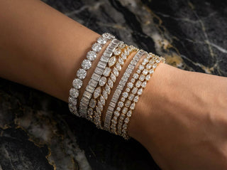 A 5-carat (5 CTW) lab grown tennis bracelet usually starts around $3,000 and can go up to $4,500 depending on the gold setting and diamond shape. A 5 carat bracelet is a popular size for an everyday tennis bracelet, with each diamond measuring around 7-10 pointers. For those looking for their first diamond tennis bracelet, our 5 Carat Round Tennis Bracelet is a classic choice. But if you're looking to add a more unique piece to your wrist stack, a fancy or mixed shape diamond tennis bracelet like our 5 CTW Emerald Bezel Bracelet provides a sleek look.